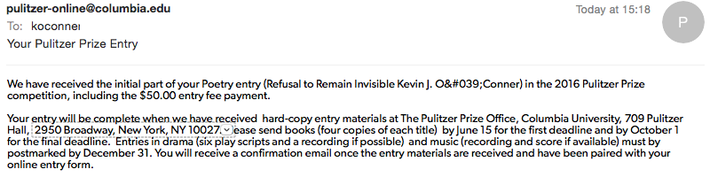 Yes, I have submitted Refusal to Remain Invisible for Pulitzer Prize consideration! Sure, my chances of actually winning are minuscule (and I’m still ultra-broke, so $50 is a fair chunk o’ change), but why not? I figure I deserve to give myself a vote of confidence once in a while…