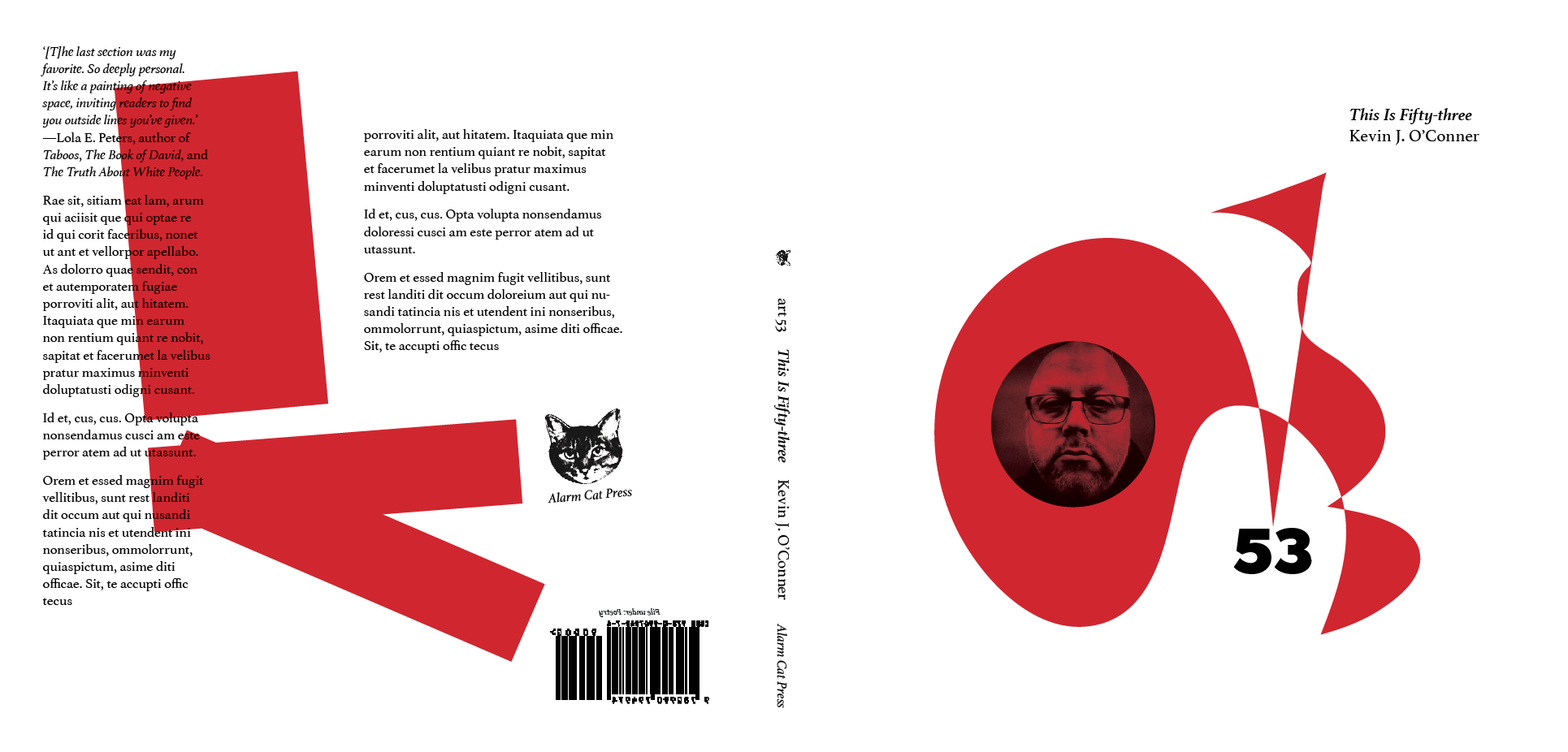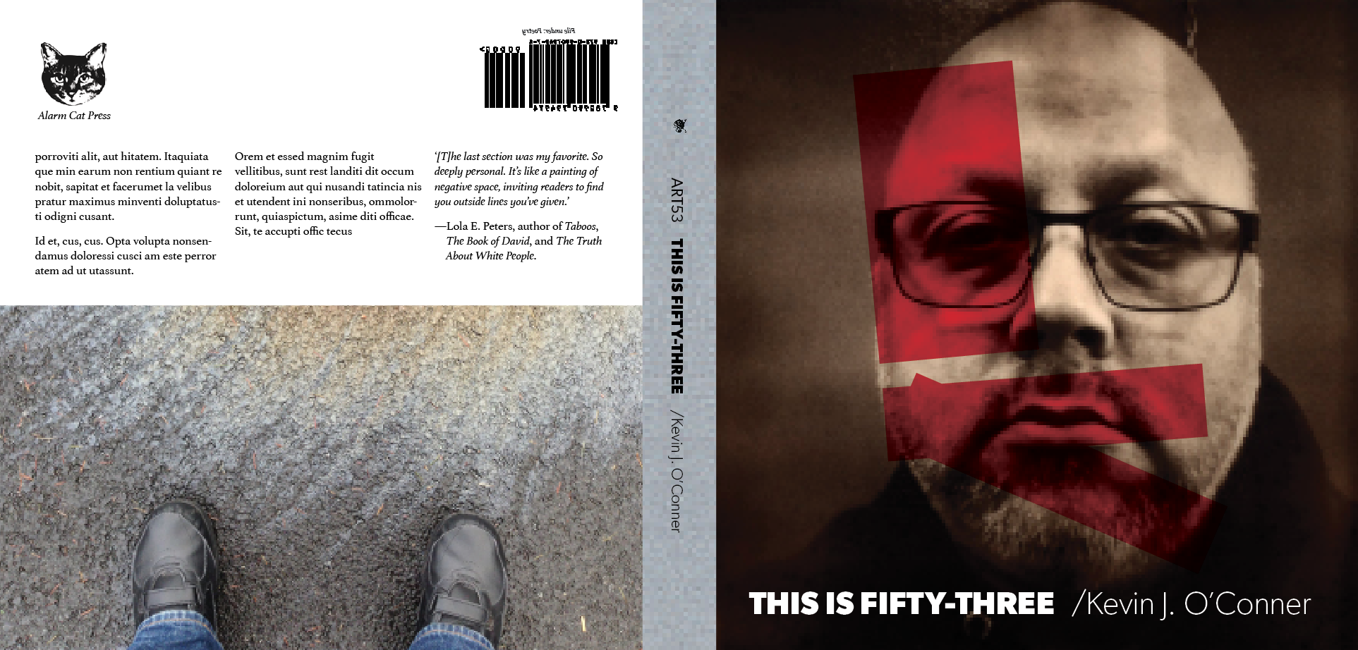 Mostly, it was about simplifying—replacing the results with simple shapes, or leaving out the more complicated stuff. I am also contemplating going back to my original first draft—or perhaps, as in the third screenshot below, combining that full-bleed photo with the red-line overlay of the other drafts. Yet another possibility would be to use the plain first draft as the cover, then use one of the alternates as the title page.