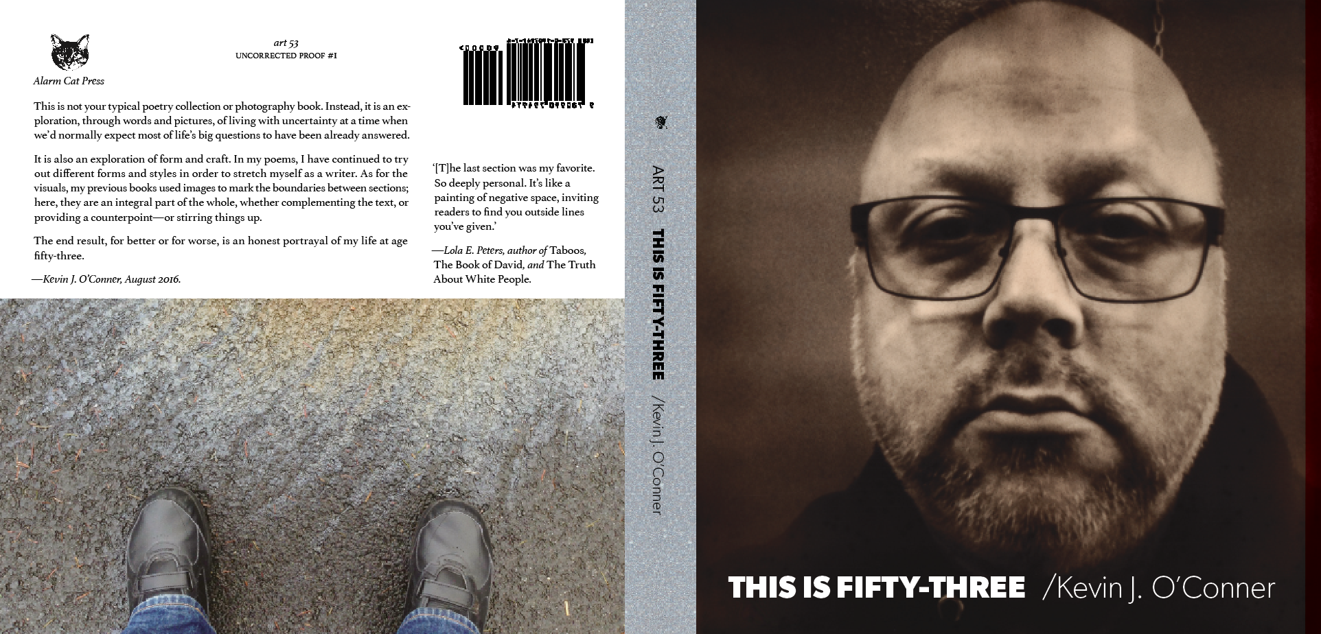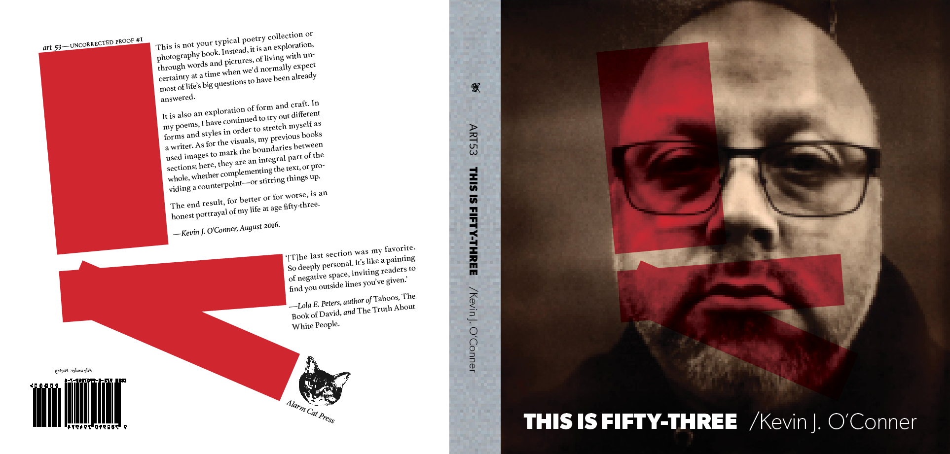 #1. A modified version of my original first draft. I overlaid a thin red stroke on the right edge of the photo just because. What I like about this version is its simplicity—straightforward in presentation, without gimmicks. The only misgiving I have is that it is extremely unusual for a poetry collection to have a photograph of the poet on the cover. It is intended to be an honest portrait of me at this point in my life, but I could see it being misinterpreted as a sign of ego.