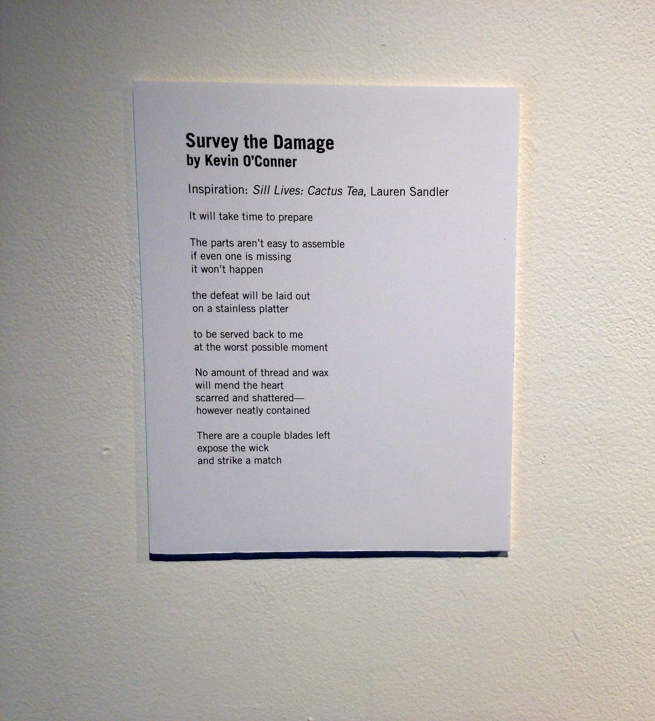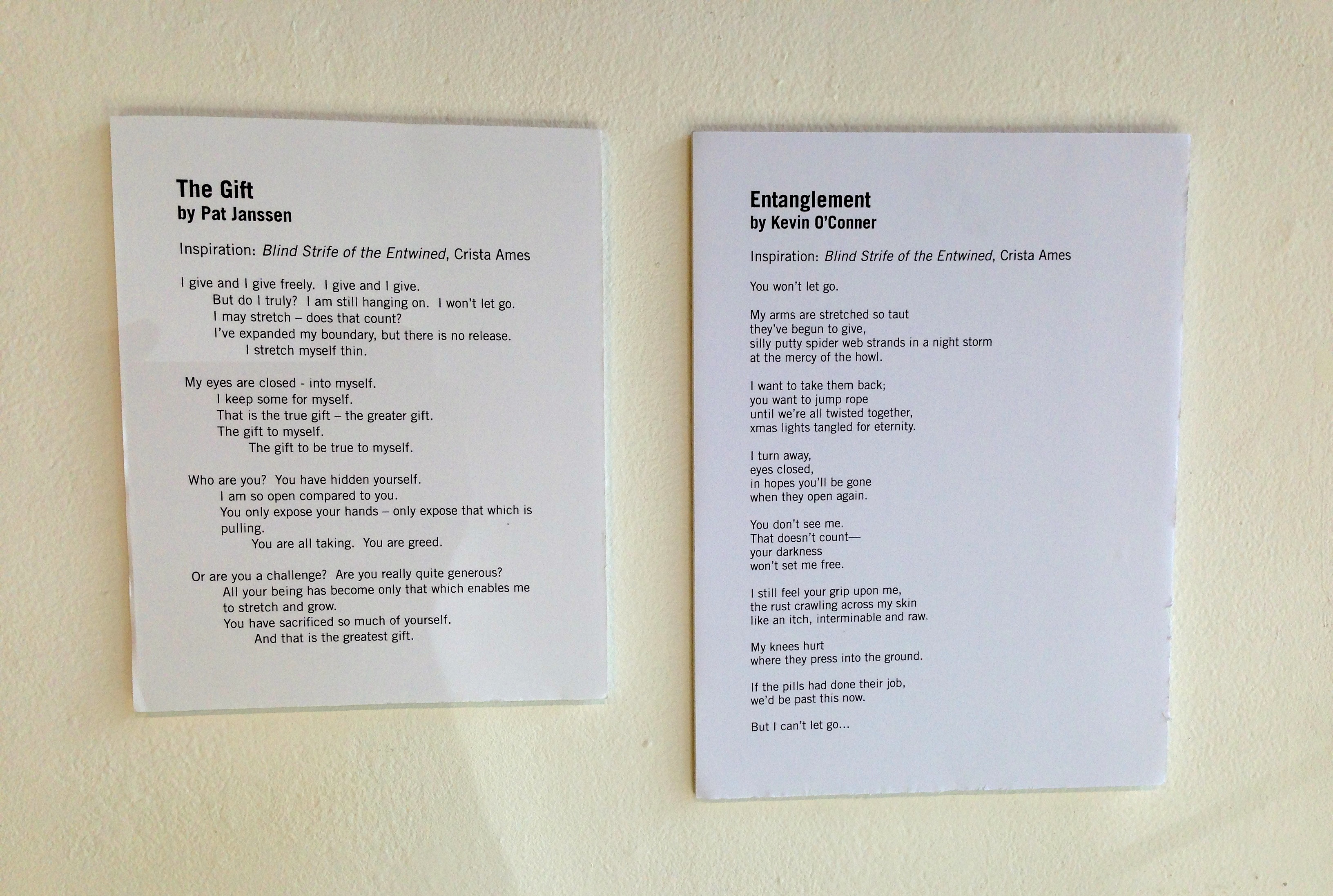 To coincide with their Clay? VI exhibit, Kirkland Arts Center solicited entries of prose (up to 1000 words) and poetry inspired by the pieces on display. ‘Selected entries’ would be chosen to be displayed with the pieces that inspired them. I submitted two poems, ‘Entanglement’ (based on Blind Strife of the Entwined, by Crista Ames) and ‘Survey the damage’ (based on Sill Lives: Cactus Tea, by Lauren Sandler). Unfortunately, I missed the August 19th reception that revealed which written works would be displayed, but I subsequently learned that both my poems were chosen.