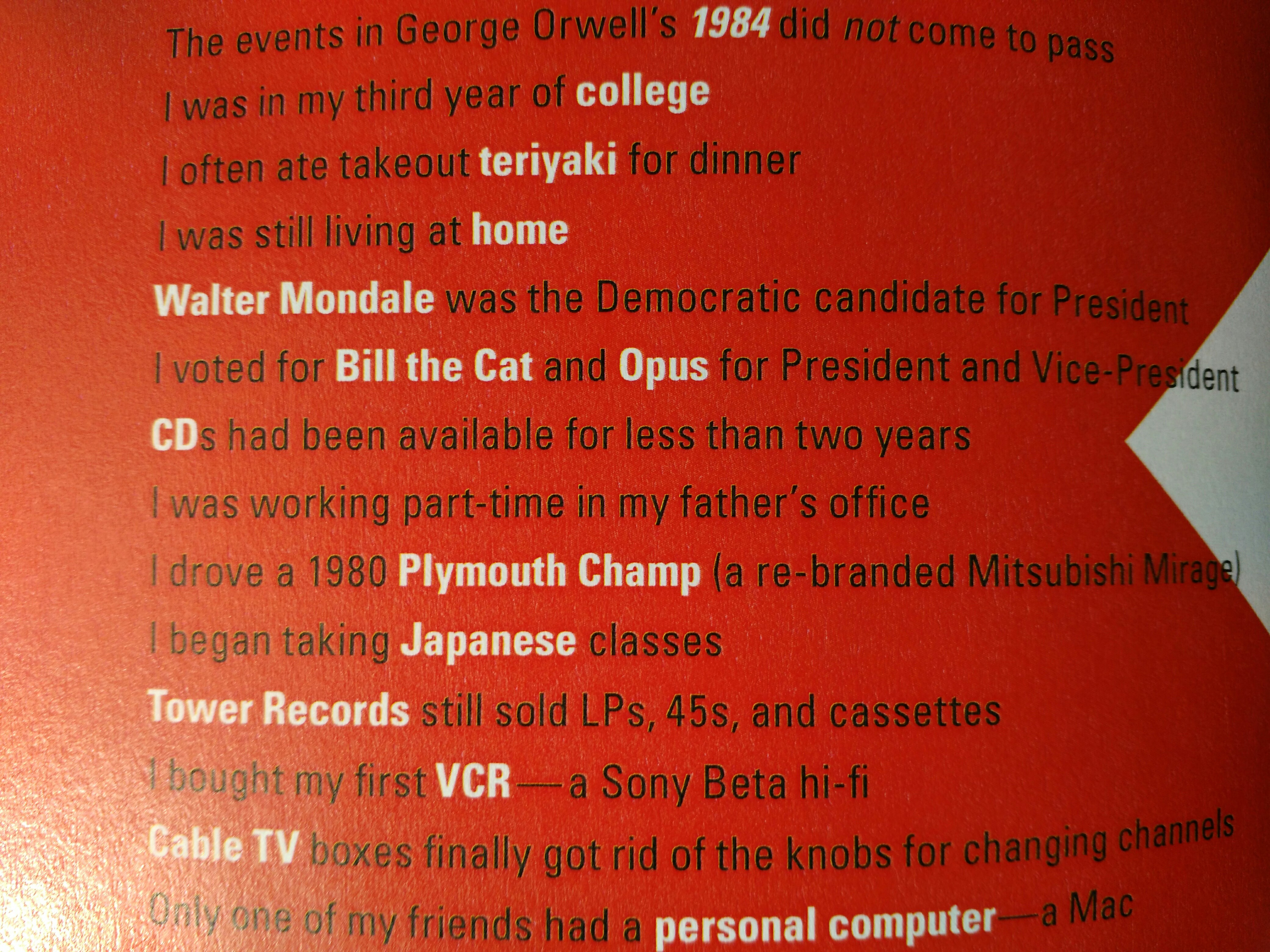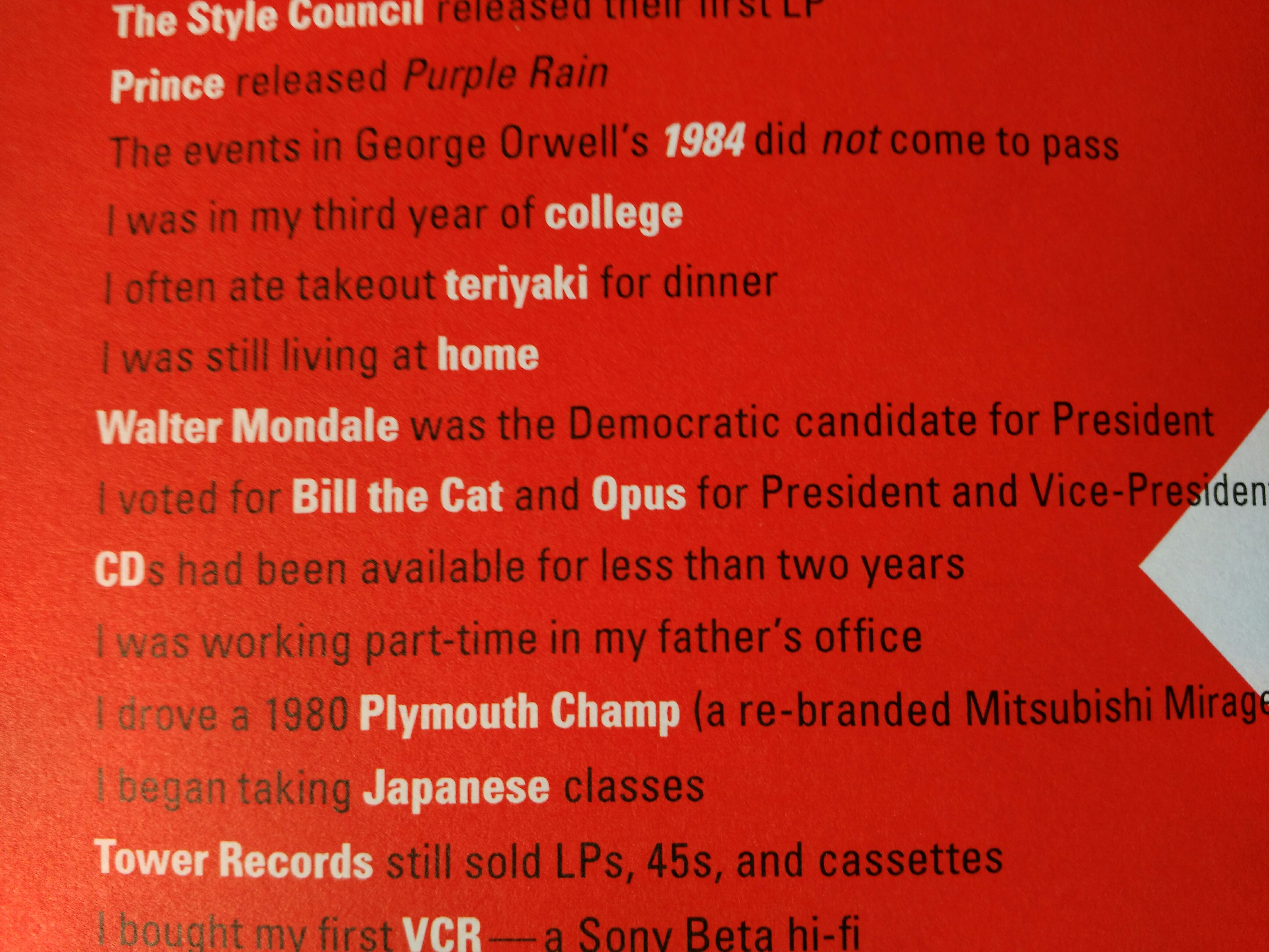 Then I get to page 180, my list of stuff about the year 1984, when I turned 21. This is what the printed proof looks like: