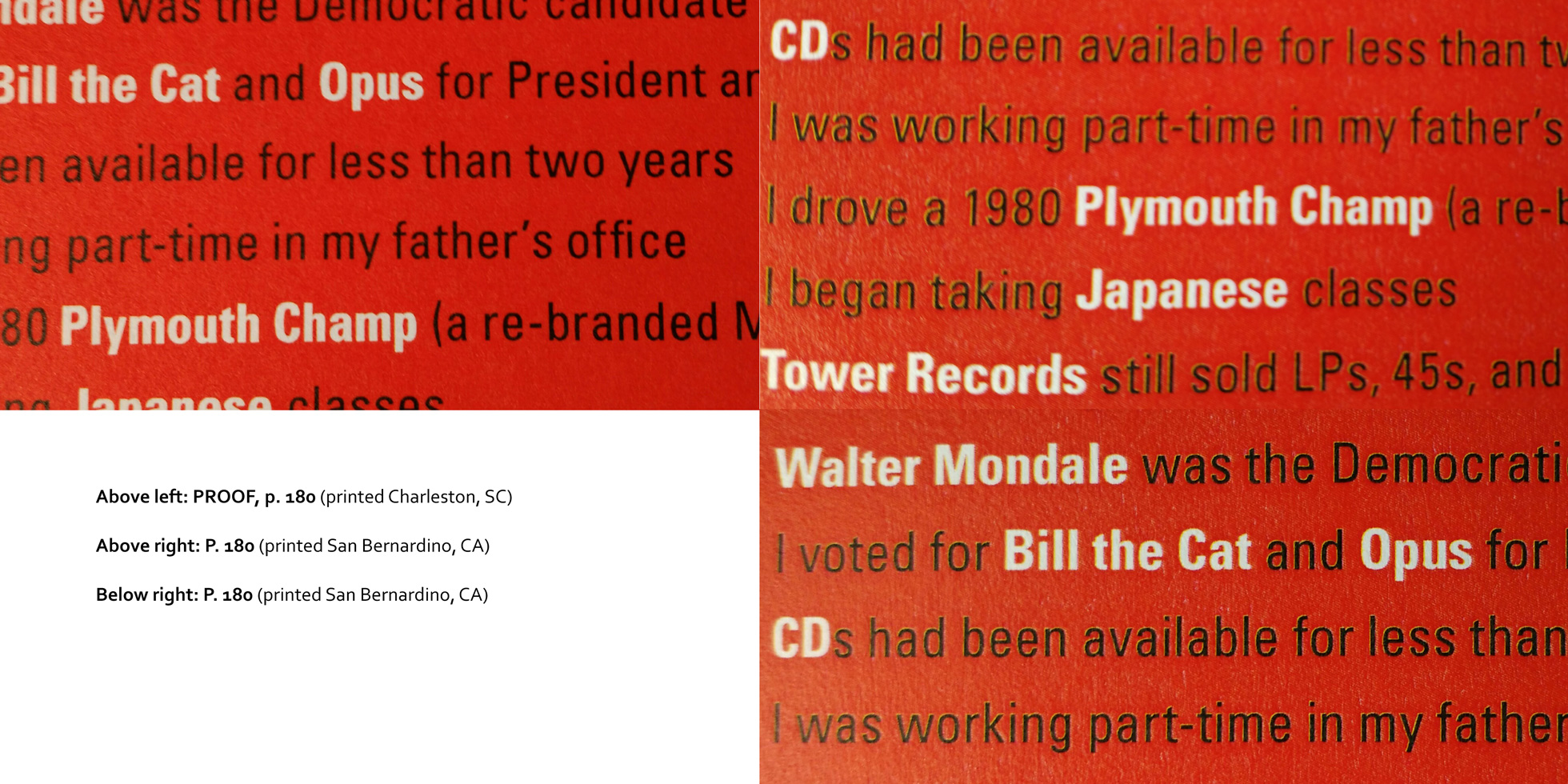 There are noticeable registration problems here—i.e., those slight gaps of white (yellow, in the second example) between the text and the red background—and it really just looks like crap. Four of the five copies I ordered are affected (though the degree does vary).
