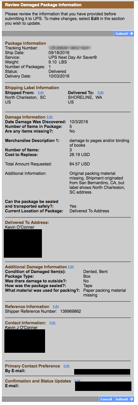 My first course of action was to file a damage claim with UPS. Of course, that presented problems, because when I clicked on the Edit link next to the shipping label information, they asked for information that was not on the label—and it’s required information, so you can’t save the information without it. Fortunately, there are sites that publish customer service telephone numbers that CreateSpace does not include on their own site. It is also a good thing that they included a field for additional information, so that I could address the discrepancy with the shipping label return address—i.e., the shipment originated in San Bernardino, CA, but CreateSpace used their North Charleston, SC address.
