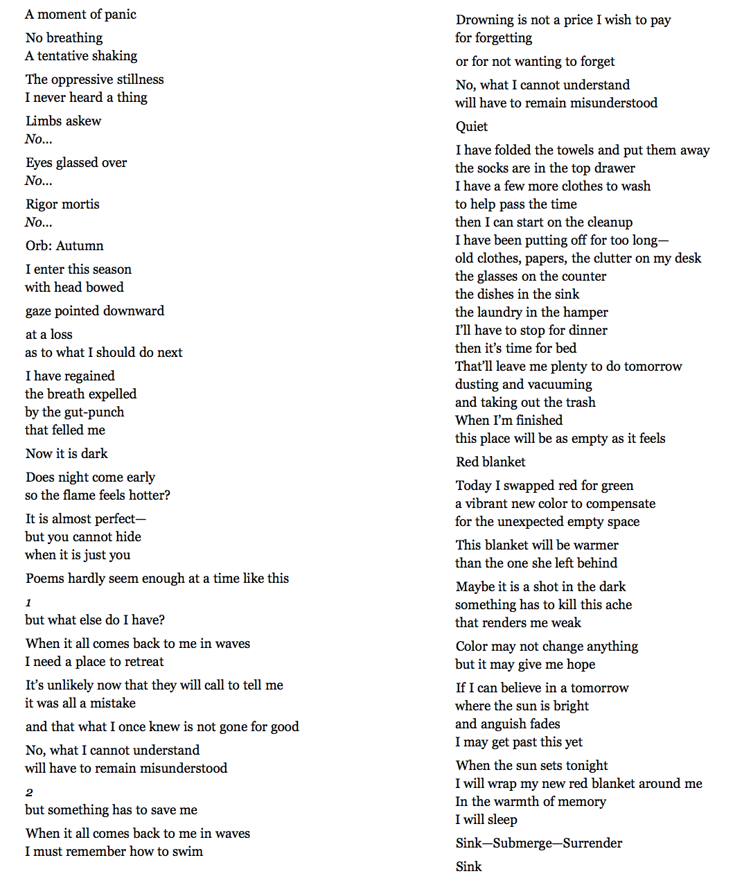 My basic paragraph formatting is intact, as is the occasional use of italics—but I have my titles formatted so that they are always preceded by line breaks. None here, even though this screenshot shows sections of six different poems, with five titles (Orb: Autumn, Poems hardly seem enough at a time like this, Quiet, Red blanket, and Sink—Submerge—Surrender) visible.