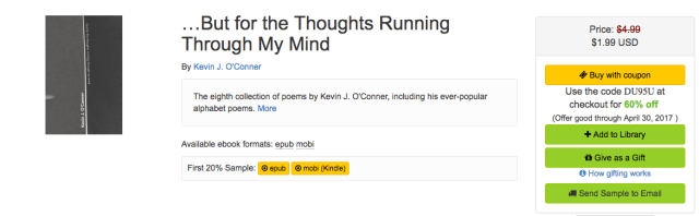 Through April 30, each title is available for $1.99, in your choice of ePub or Kindle formats. Simply click on the Buy with coupon button, and the discount will be applied automatically (as shown in the screenshot below).
