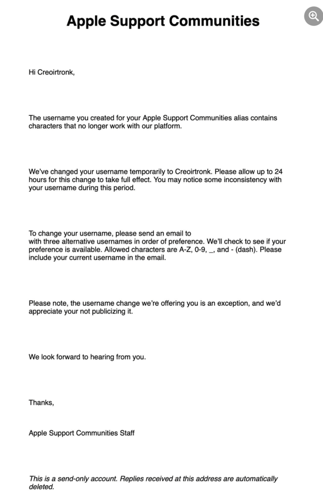 This is actual email I received from Apple earlier today. Apparently, their support “community” cannot handle the lowly apostrophe, which has been part of my name since birth, and part of my username for at least the last 10 years.