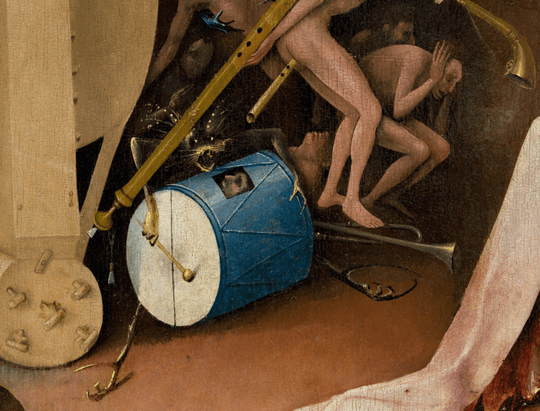 The napowrimo.net prompt for day 6 is to write an ekphrastic poem based on Hieronymous Bosch’s The Garden of Earthly Delights. I went with the wolf-like creature playing the drum…
