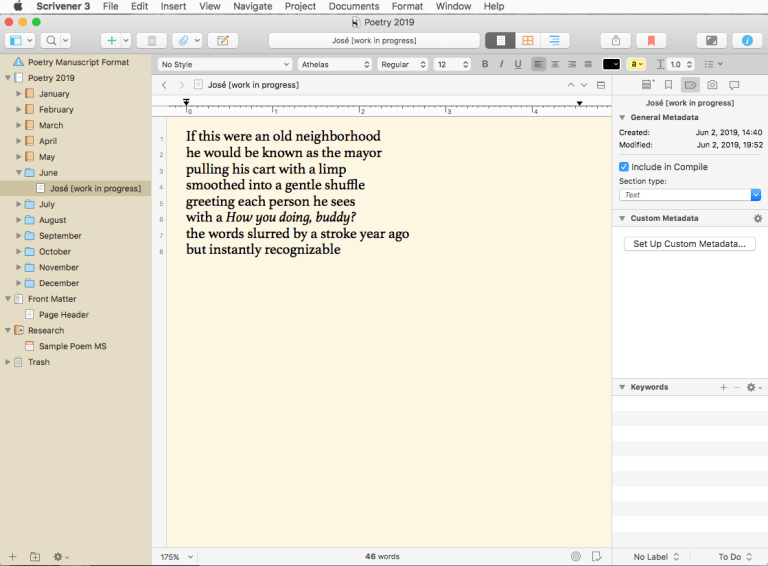 It took me a bit longer than expected, but I now have all my poems for 2019 copied over into Scrivener. Part of the delay was due to three consecutive days of readings to attend; the rest was caused by syncing problems with cloud services, which ultimately led me to sign up for Dropbox again. (I had originally dropped Dropbox when they limited basic-account access without warning.)